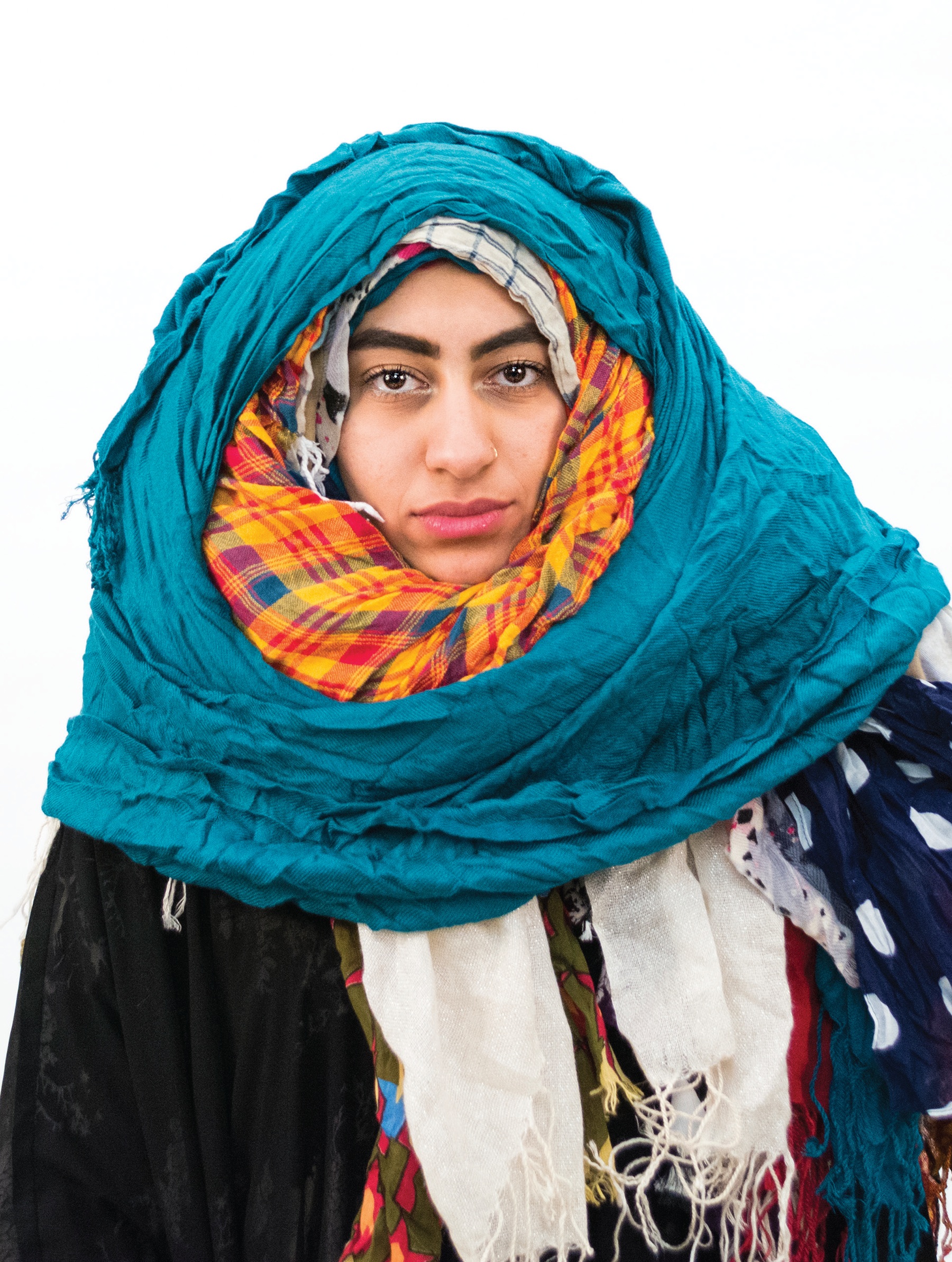 Photo of a woman wearing multiple, bulky headscarves.