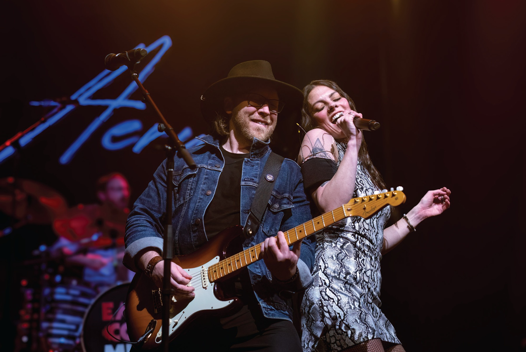 Photo of a man and a woman onstage performing with a guitar and microphone..
