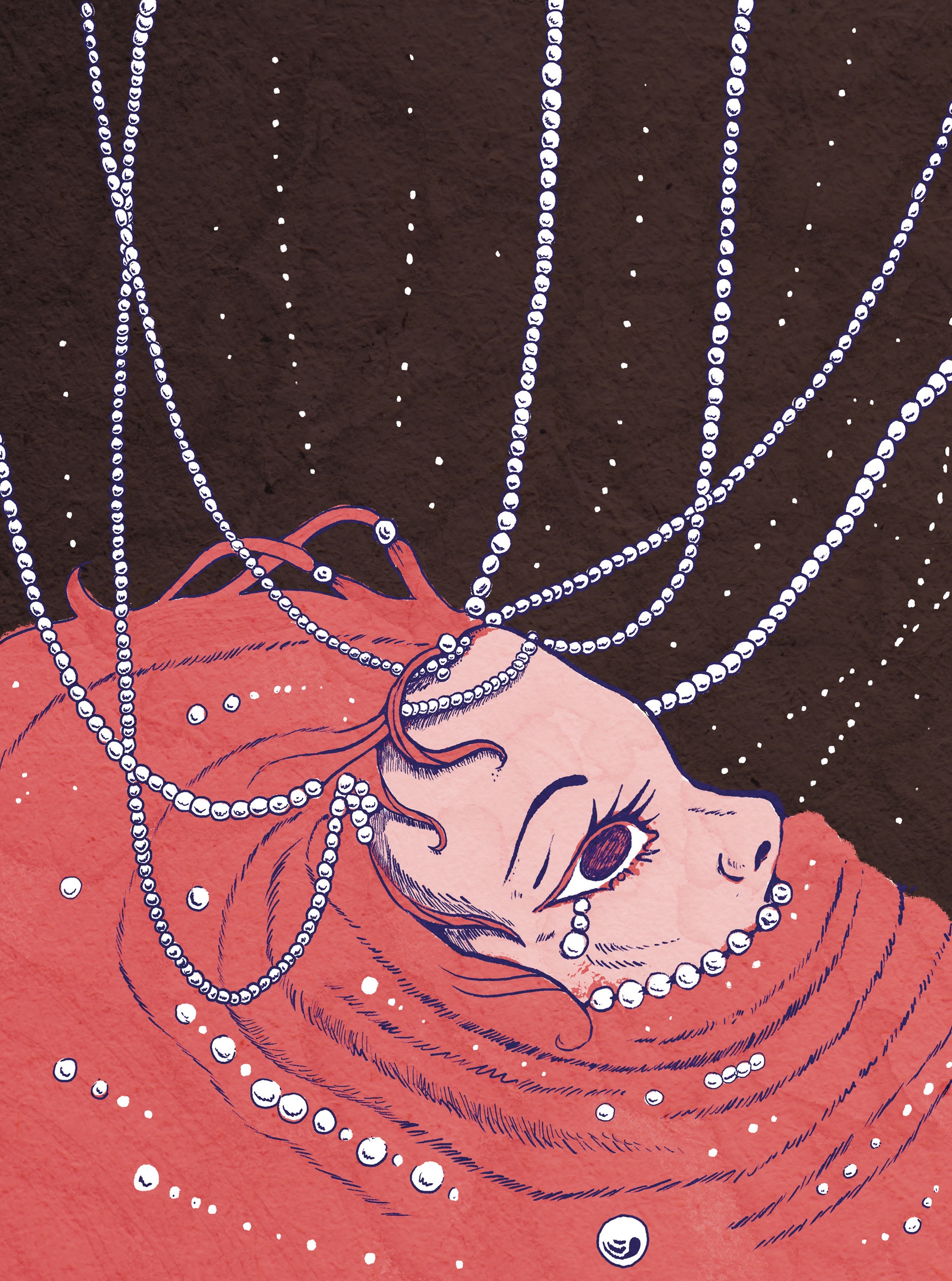 Illustration of a person in a red headscarf with threads of pearls rising off of them into a black background.